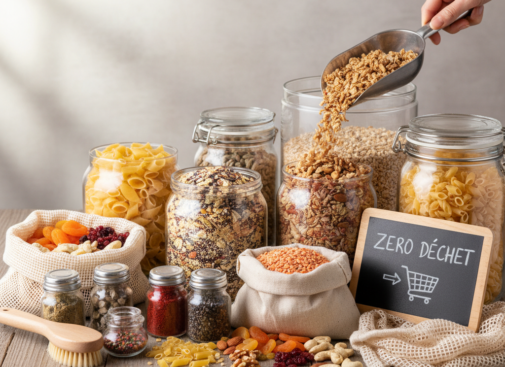 Fruits, légumes locaux et bio, articles vendus en vrac, accessoires Zéro Déchets (sacs à vrac, bocaux et